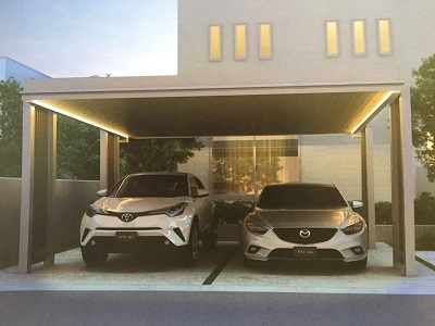 1台用・2台用カーポート、マルチルーフというラインアップから、弊社が選んだのはマルチルーフ!本体色はホワイトで天井材はオレンジチェリーです。