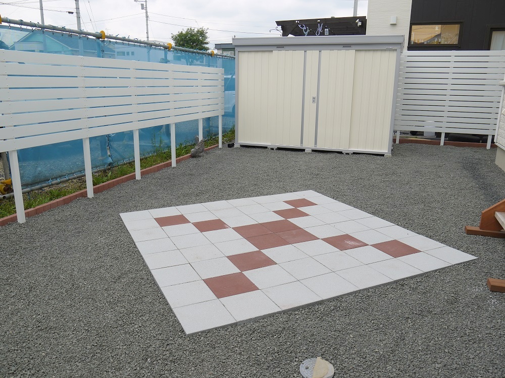 千歳市:A様邸 爽やかな白いフェンスと物置が特徴的な庭