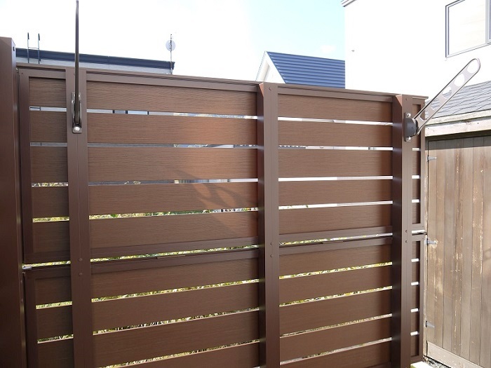ウッドデッキにはフェンスを設置しました。ディーズガーデン 耐候性樹脂のアルファウッドユニットフェンスです。色は4種類あり、こちらはディープブラウンです。