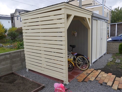 すでに設置しているスチール製物置の横に、木製自転車置き場を作りました。